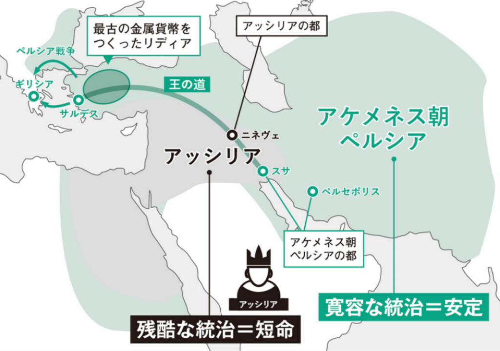 「王の道」とよばれる道をはりめぐらしうえで、ところどころに中継地をもうけ、駅伝制を施行します。小アジアの地方都市から首都スサまでなら、早馬で7日間もあれば到着したそうです。