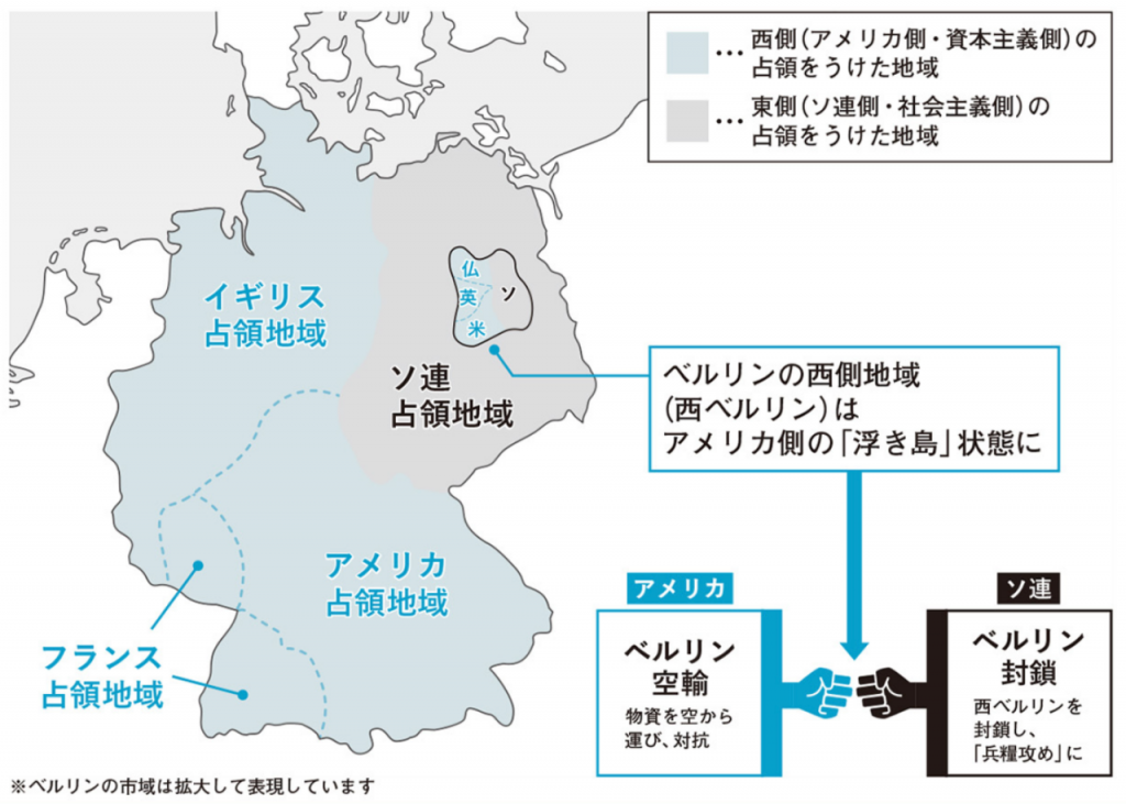 これに憤慨したソ連は、共同で管理していた都市ベルリンの一部を封鎖し、3カ国を域内から排除します(ベルリン封鎖)。